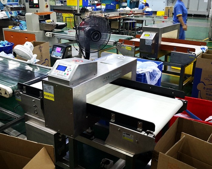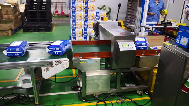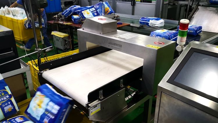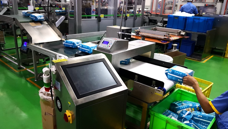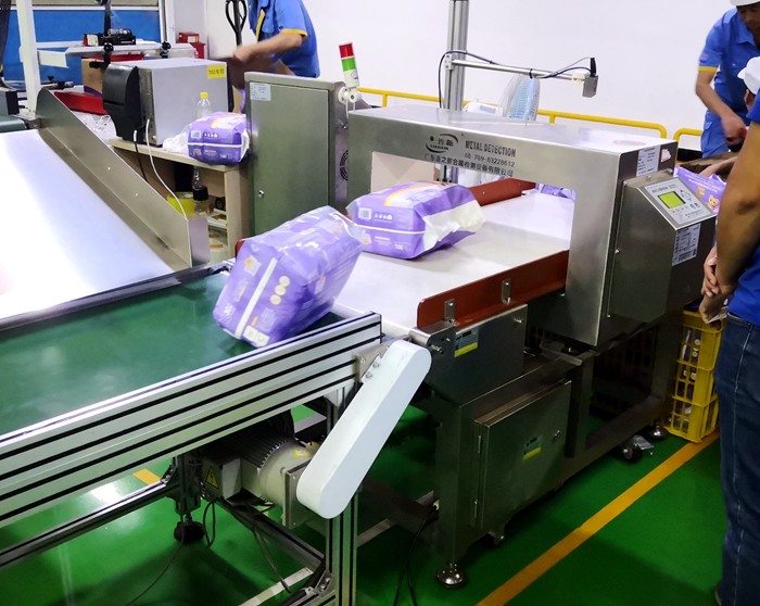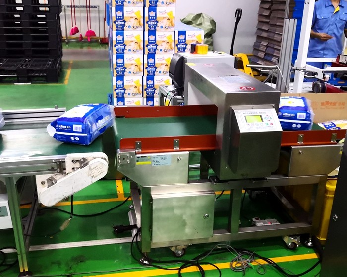 以下為漢氏衛(wèi)生用品紙尿褲生產(chǎn)線使用連之新金屬檢測機(jī)的部分現(xiàn)場: